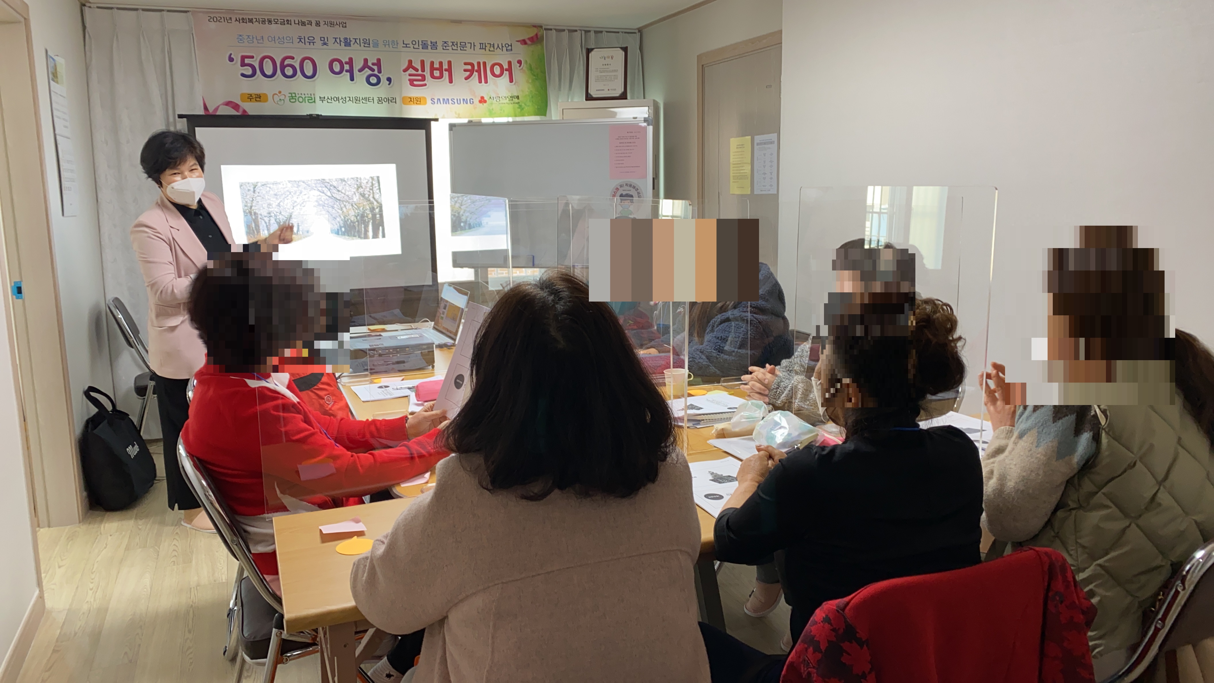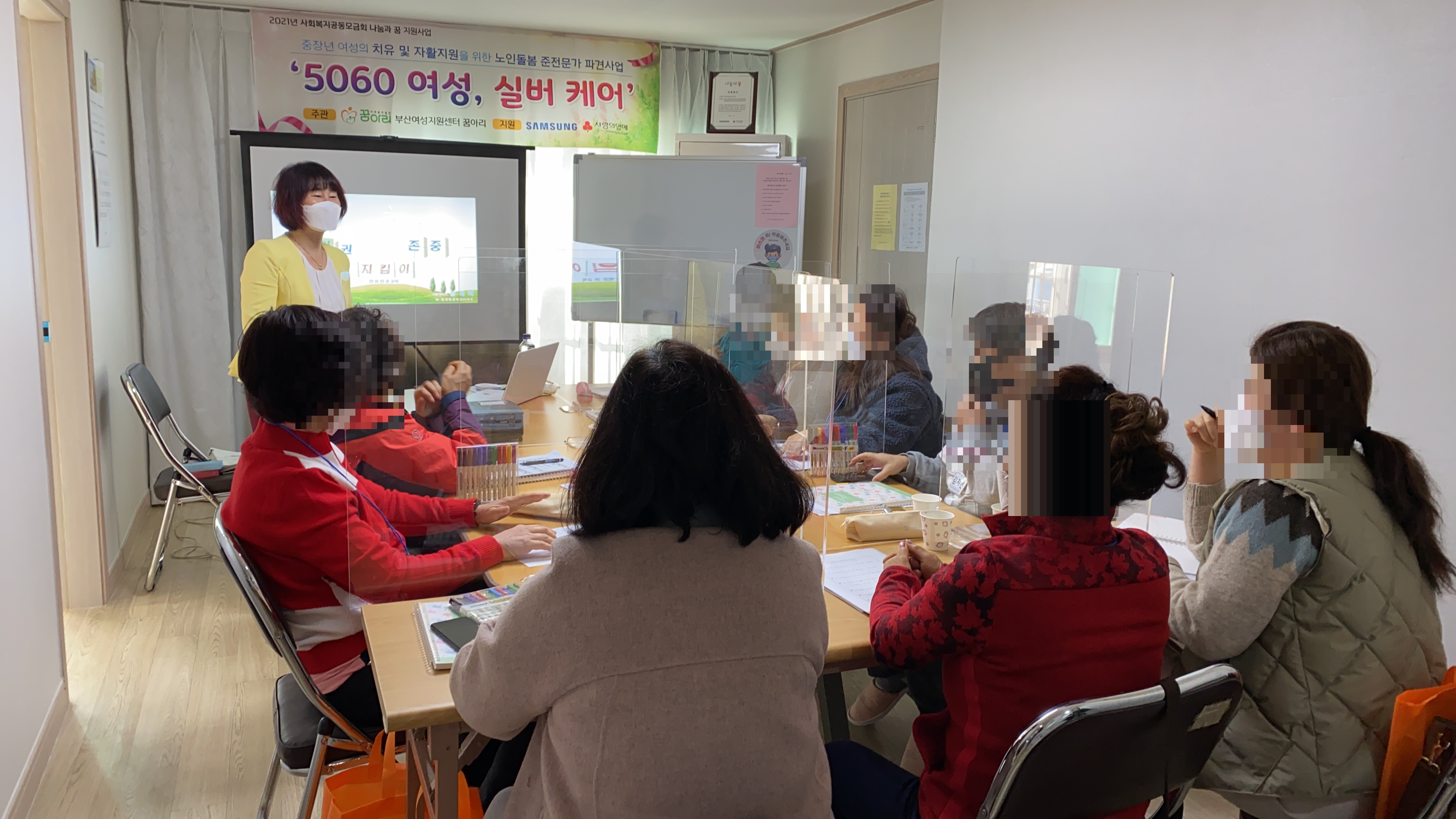 ![]() ![]() ‘5060 여성, 실버케어’ 2일차 집단교육 실시!!! 오늘 3월 18일(목)에는 2021년 사회복지공동모금회 나눔과 꿈 지원사업 - 중장년 폭력피해여성의 치유 및 자활지원을 위한 노인돌봄 준전문가 파견사업 ‘5060여성, 실버케어’ 2일차 집단 교육을 실시하였습니다. 사업참여자 10명은 모두 일찍 오셔서 출석 및 발열체크, 자가문진표를 작성하고 서로에게 인사를 하며 수업준비를 하시는 모습에서 열정을 느낄 수 있었습니다. 10시~12시에는 소양교육(인성 및 인권교육)을 실시하고 12시~13시에는 맛있는 점심 도시락을 먹고 13시~15시에는 안전보건교육(생활속에서의 응급처치)을 하였습니다. 둘째날이여서 조금은 편안한 모습과 적극적인 모습으로 수업에 참여하는 뜻깊은 시간이였습니다. |